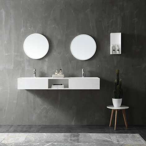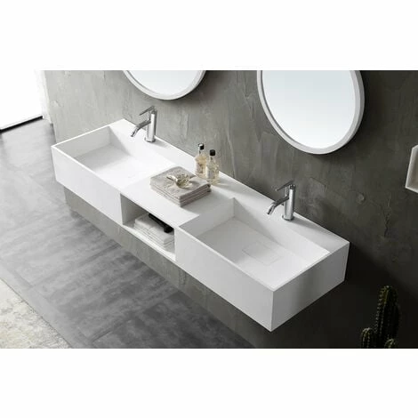 Double vasque à suspendre TWG235 en pierre solide – blanc mat – avec espace de rangement