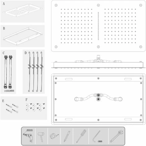 La pomme de douche est montée directement dans un plafond suspendu à l’aide du cadre d’installation fourni. Ainsi, aucun tuyau de raccordement est visible. La douche de tête est au même niveau que votre plafond.