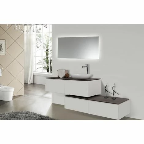 Toutes les meubles sont déjà montés et prêts à être fixés contre le mur de votre salle de bain. La vasque à poser O-540 avec bonde Pop-up ainsi qu’un couvercle supplémentaire en blanc figurant sur la photo ne font pas partie de la livraison mait peuvent-être commandés en option.