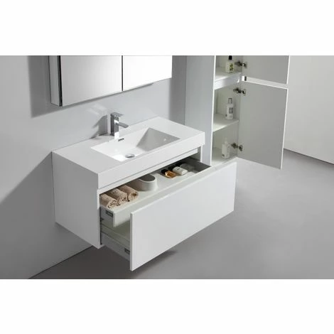 La surface du meuble est lisse et vernie deux fois . Nos meubles de salle de bain sont ainsi imperméables avec une surface brillante et facile à entretenir.