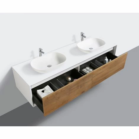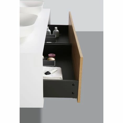 Le meuble vous permet d’y placer deux vasques à poser. Les deux tiroirs ont une échancrure pour le siphon. Le trou pour l’orifice d’écoulement et le trou pour la robinetterie ne sont pas pré-percés. Vous avez ainsi le choix entre un robinet à poser ou un robinet à encastrer. La vasque, le siphon pour l’écoulement et la robinetterie ne font pas partie de la livraison. Découvrez sur notre site BERNSTEIN notre grand choix en robinetterie.