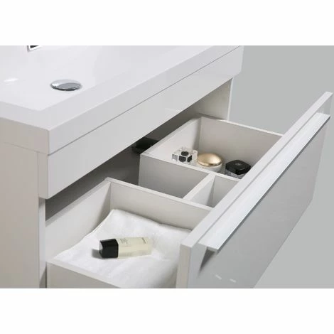 La surface du meuble est lisse et vernie. Nos meubles de salle de bain ont ainsi un revêtement hydrofuge avec une surface brillante et facile à entretenir.