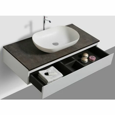 Le meuble sous vasque est livré monté et prêt à être fixé sur le mur de votre salle de bain. La vasque à poser O-540 avec bonde Pop-up ainsi qu’un couvercle supplémentaire en blanc figurant sur la photo ne font pas partie de la livraison mais peuvent-être, ainsi qu’un miroir, commandés en option.