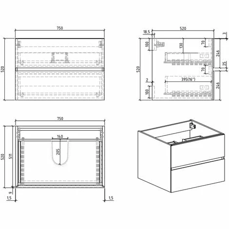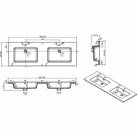 | Dimensions 2 x sous vasque | 150 x 52 x 52 cm (L x P x H) |