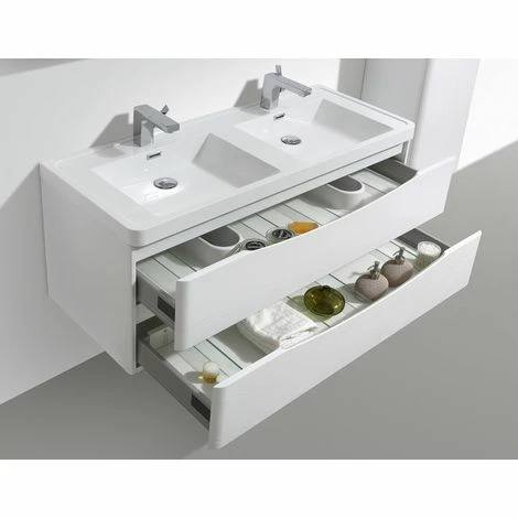 Le meuble sous vasque dispose de deux tiroirs avec séparations en verre. Toutes les armoires sont déjà pré- montées et prêtes à être fixées contre le mur de votre salle de bain.