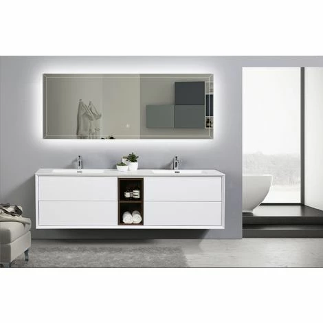 La double vasque est en pierre de synthèse (fonte minérale) de qualité supérieur, la surface est non poreuse, hygénique et facile à nettoyer. La bonde Pop-up est livrée avec le meuble. Découvrez sur notre site notre grand choix en robinetterie,qui ne fait pas partie de la livraison.