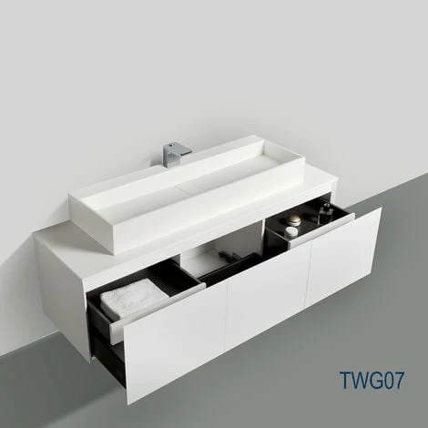 Luna 1600 est équipé de 3 trois tiroirs ainsi que deux tiroirs de rangement supplémentaires à l’intérieur du meuble. Ils sont aménagés de charnières en métal de qualité supérieure et d’un système de fermeture automatique facile et en douceur dit Soft-Close. Le tiroir du milieu offre suffisament d’espace pour ranger vos produits à la verticale.