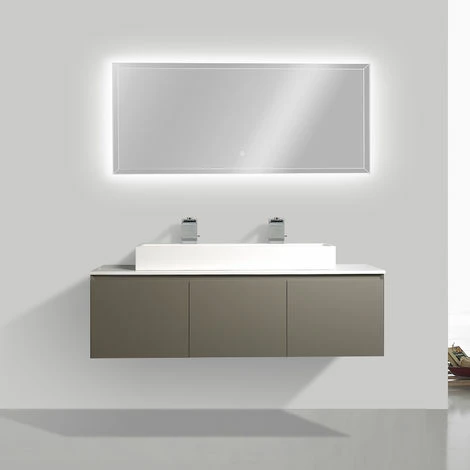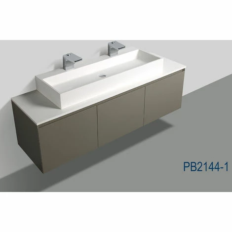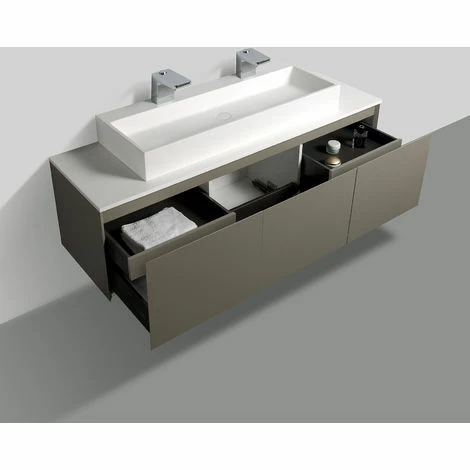Sur le meuble en gris mat, se trouve un plan vasque en pierre de synthèse, Solid Stone de qualité supérieure. Les trous pour la robinetterie et l’écoulement ne sont pas pré-percés. Vous avez ainsi le choix entre un robinet à encaster ou à poser. Découvrez un large choix de robinets assortis au meuble Luna 1600 dans notre boutique en ligne. Les vasques PB2144-1 et TWG07 ne font pas partie de la livraison mais peuvent être commandées en option.