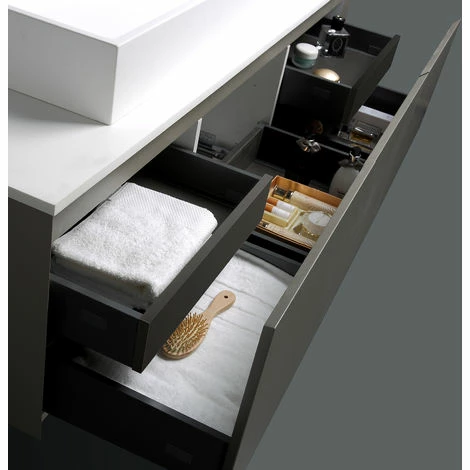 Luna 1600 est équipé de 3 trois tiroirs ainsi que deux tiroirs de rangement supplémentaires à l’intérieur du meuble. Ils sont aménagés de charnières en métal de qualité supérieure et d’un système de fermeture automatique facile et en douceur dit Soft-Close. Le tiroir du milieu offre suffisament d’espace pour ranger vos produits à la verticale.