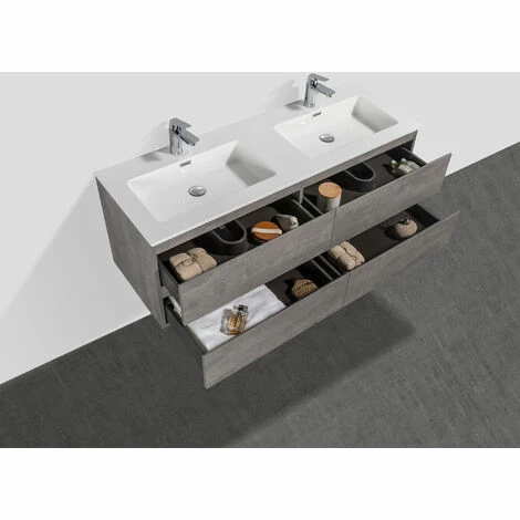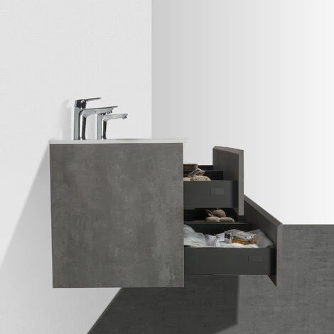 L’ensemble est de très grande qualité et bénéficie d’une excellente finition. Les tiroirs sont aménagés de charnières en métal de qualité supérieure et d’un système de fermeture automatique et facile dit Soft-Close, les côtés en métal sont extrêmement résistants. Des ouvertures pour le passage du siphon sont incorporées au tiroir du haut. Le meuble sous vasque est livré prémonté, prêt á être fixé sur le mur de votre salle de bain.