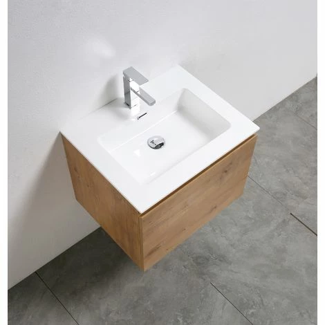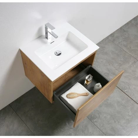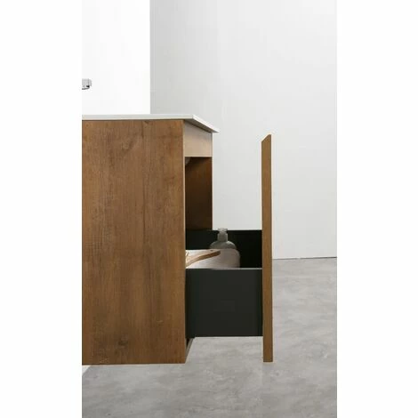 La surface en optique chêne de l’ensemble Alice 600 apporte une touche naturelle et confortable dans votre salle de bain! Grâce à une largeur de seulement 60cm, ce meuble est idéal pour les petits espaces.