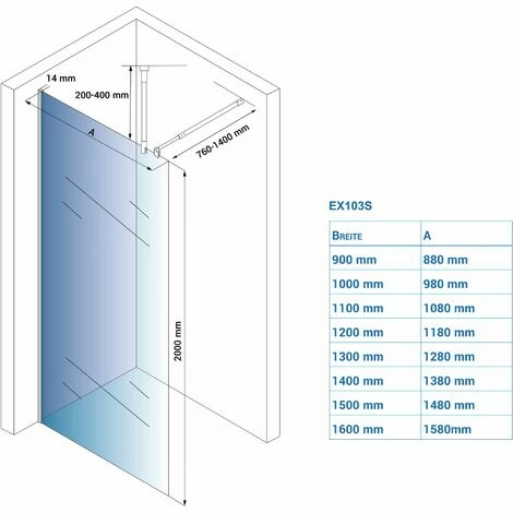 Nous vous proposons la paroi de douche EX103S en plusieurs dimensions avec profilé mural de 14mm en acier inoxydable brossé ou noir mat brossé et pour plus de renfort, un barre de fixation plafond ainsi qu’une barre de stabilisation (à partir d’une largeur de verre de 130 cm la barre de stabilisation ou le support plafond sont inclus). Faites votre choix en haut de la page, au début de l’offre.