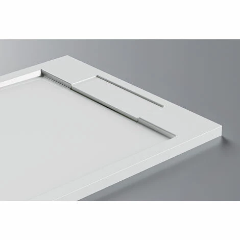 Bac à douche extra plat avec vidage par écoulement gravitaire. Au dessus de l’orifice d’évacuation se trouve un couvercle de protection amovible de la même matière que le receveur.