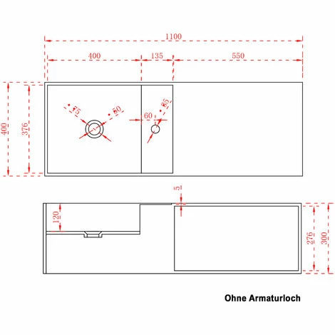 | sans trou prépercé pour la robinetterie | |