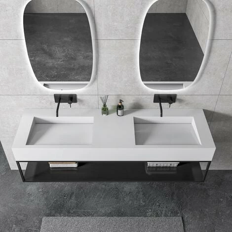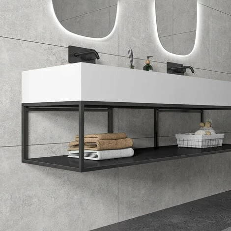 La console 150S de style industriel conçu pour un montage mural, sert de support pour les vasques suspendues. Le cadre et l’espace de rangement en noir mat sont en acier inoxydable. Grâce à un revêtement en poudre, la surface de la console est particulièrement robuste, résistante aux chocs et aux rayures. Le meuble d’une largeur totale de 153 cm, offre un espace de rangement ouvert avec suffisamment de place pour vos serviettes de bain ou autres produits. L’épaisseur du cadre est de 15 mm.